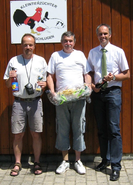 Auf dem Gruppenbild sind u.a. zu sehen Herr István Eibel, Vorsitzender des Ungarischen Vereins (hintere Reihe, 3. von rechts), links neben ihm ist Herr Rolf Stoll, Vorsitzender des Kleintierzuchtvereins Z198 Wolfschlugen zu erkennen. Rechts außen stehend ist Manfred Riek, Vorsitzender des Kreistierzuchtverbandes Untere Filder sowie links neben ihm Bürgermeister Matthias Ruckh zu sehen. In der vorderen Reihe kniend (hinter dem Pokal) Stefan Raindl, Vorsitzender des Stauferland Tauben- und Zwerghuhnzuchtvereins. Nach dem gemütlichen Abschluss traten neben kleinen Geschenken lokaler Produkte sowie ein Wolfschlüger Bildband auch drei lebende Zwerghühner (Bildvordergrund) aus der Wolfschlüger Zucht die rund 1.100 km lange Heimreise nach Ungarn an. (ru)