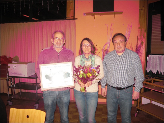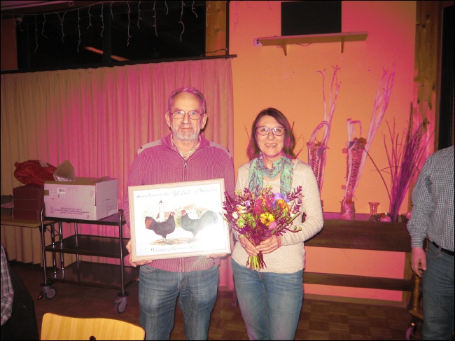 Bereits im Vorfeld hatte Vorsitzender Rolf Stoll bekannt gegeben, dass er für eine weitere Amtszeit nicht mehr kandidiert. Zu seinem Nachfolger wurde Wilhelm Bauer gewählt. Dessen erste Amtshandlung war die Ernennung von Rolf Stoll zum Ehrenvorsitzenden des Vereins. Rolf Stoll hat sich seit seinem Eintritt in den Verein 1972 immer sehr engagiert eingebracht. Als Jugendwart, dann als 2. Vorsitzender und seit nunmehr zehn Jahren als 1. Vorsitzender. Als kleines Dankeschön wurde ihm ein Gemälde mit der von ihm gezüchteten Rasse und seiner Frau Lydia ein Blumenstrauß für die jahrzehntelange Unterstützung überreicht.
